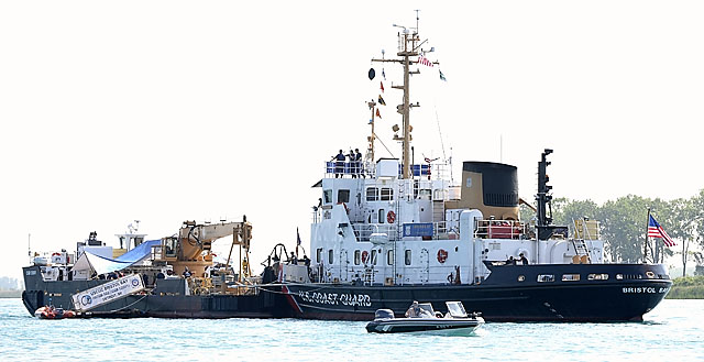 This USCG barge serves as a central command post with temporary holding cells on-board.