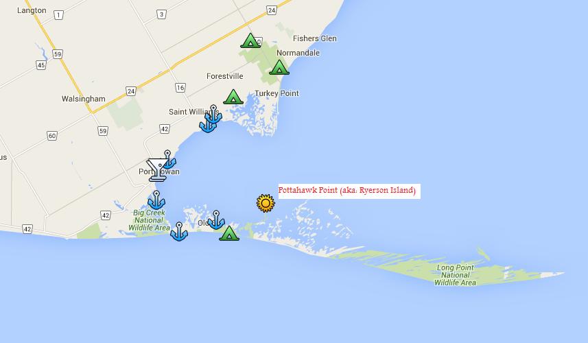 Where: Pottahawk Point (aka: Ryerson Island) in Lake Erie, off the coast of Long Point, Ontario, Canada. Most boats launch from MacDonald Turkey Point Marina (92 Clubhouse Road, Vittoria, Ontario, Canada).