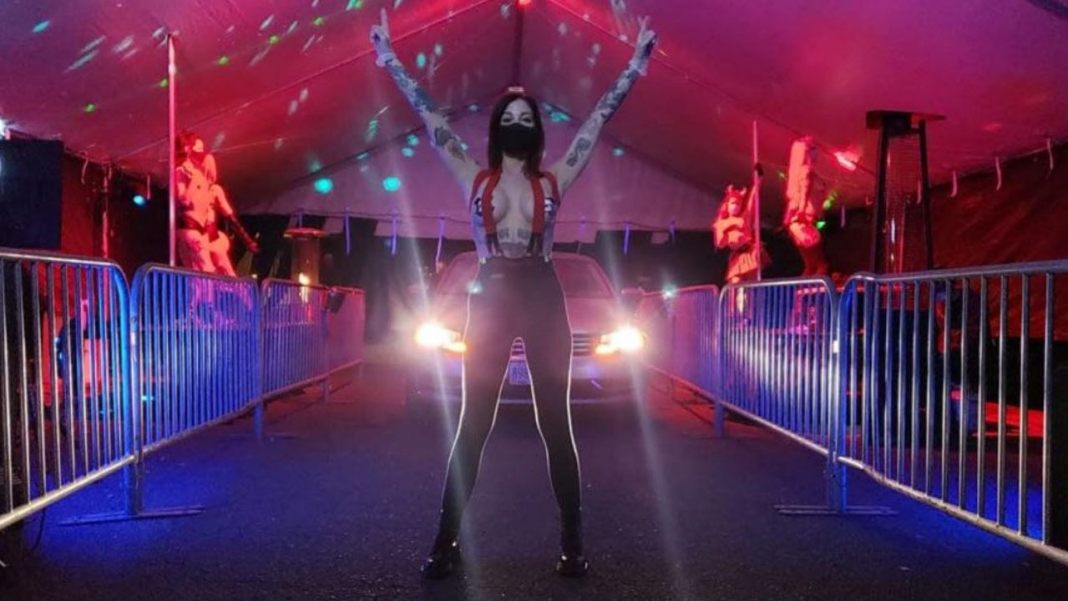 Customers slowly drive through a tent that contains four dancers and a DJ.
