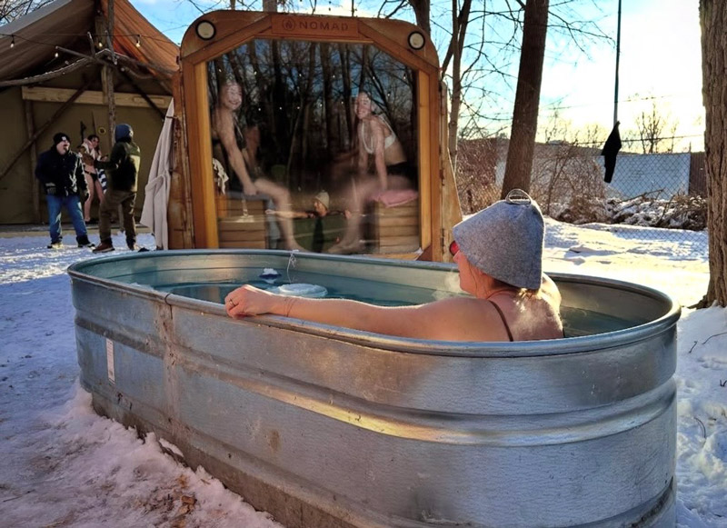 The current setup includes three wood-fired saunas ranging in size and intensity, a cold plunge tub with a larger communal plunge in development, and a canvas tent that serves as a changing area and gathering space.