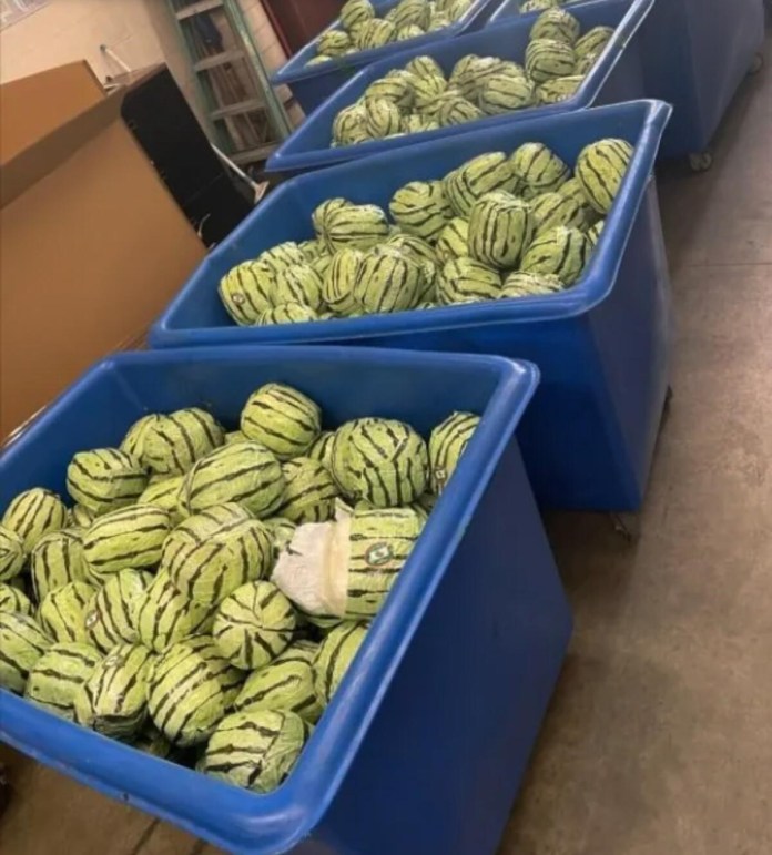 The drugs were wrapped in plastic painted in two shades of green to resemble the fruit and placed among real watermelons. They were intercepted at the Tijuana-San Diego border crossing.