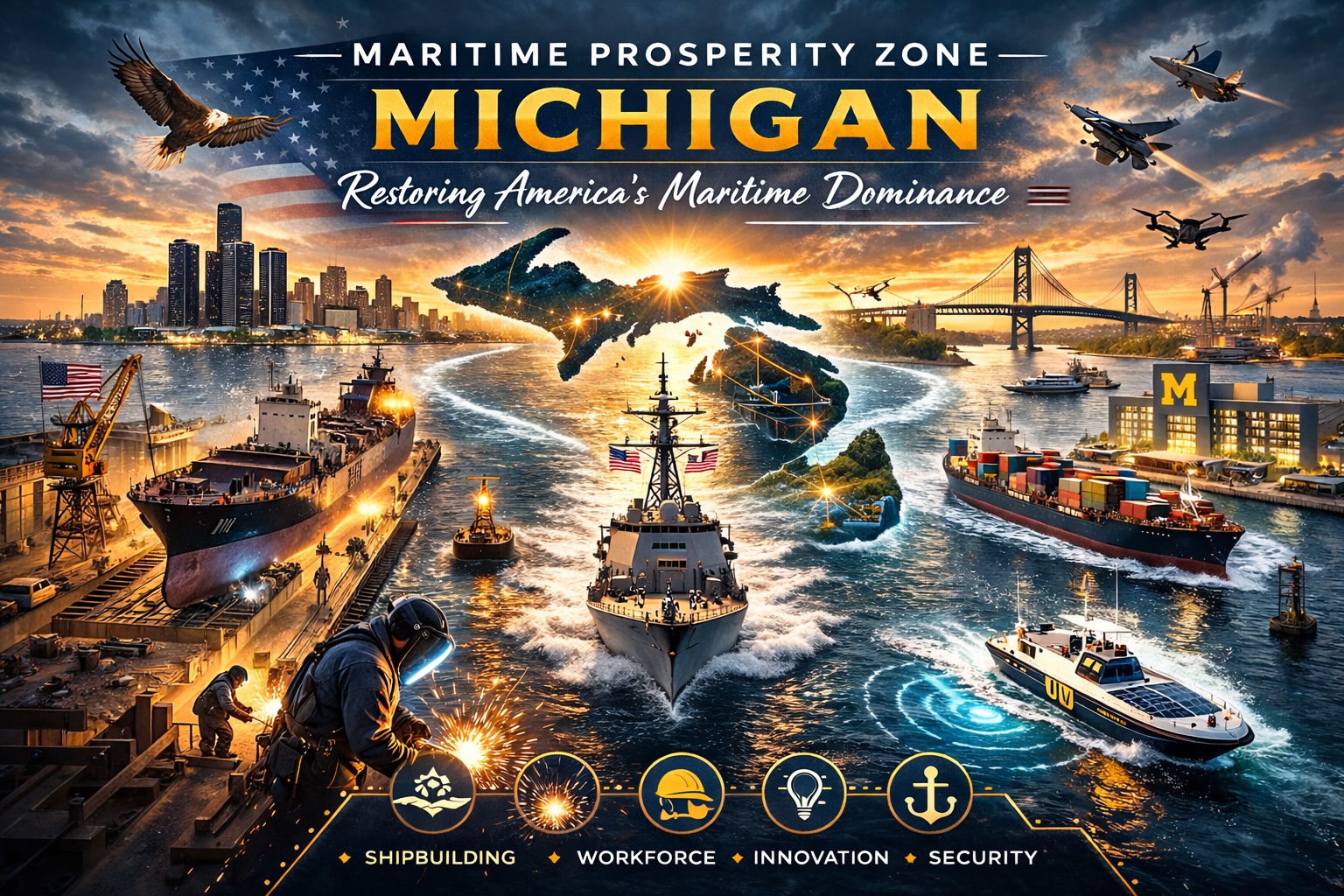 With 3,200 miles of shoreline, 33 active ports, and a central position along the Great Lakes-St. Lawrence Seaway, Michigan provides a secure inland alternative to traditional coastal shipbuilding regions.