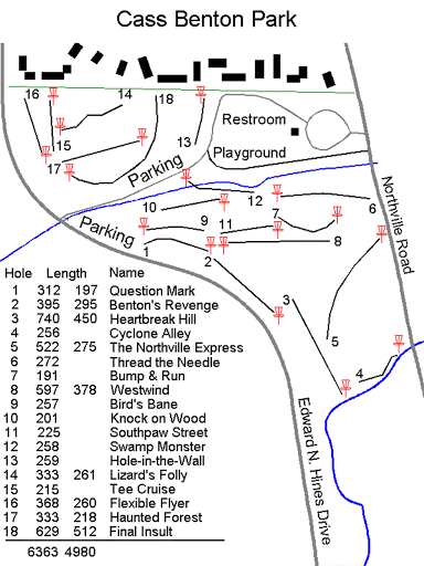 Cass Benton is an 18-hole disc golf course inside of beautiful Hines Park that was created in 1999.
