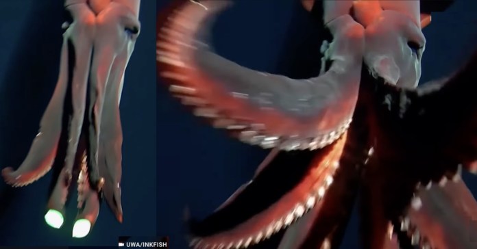 “The squid, which was about [30 inches] 75cm long, descended on our camera assuming it was prey, and tried to startle it with its huge bioluminescent headlights,” Stewart added.
