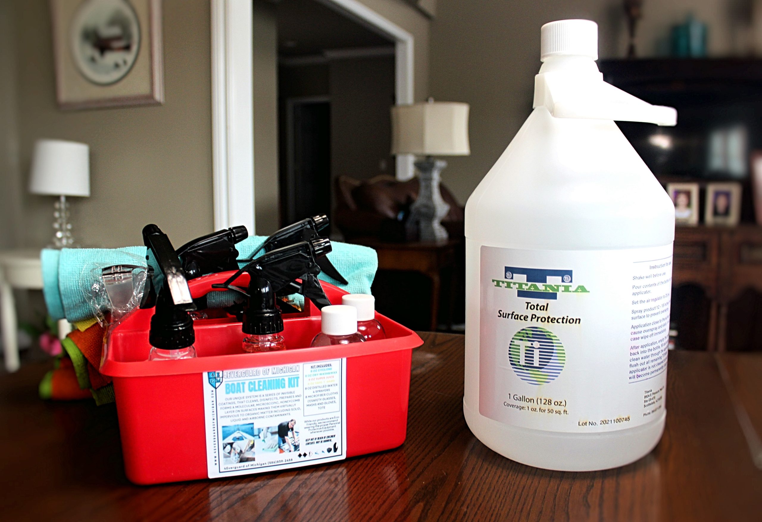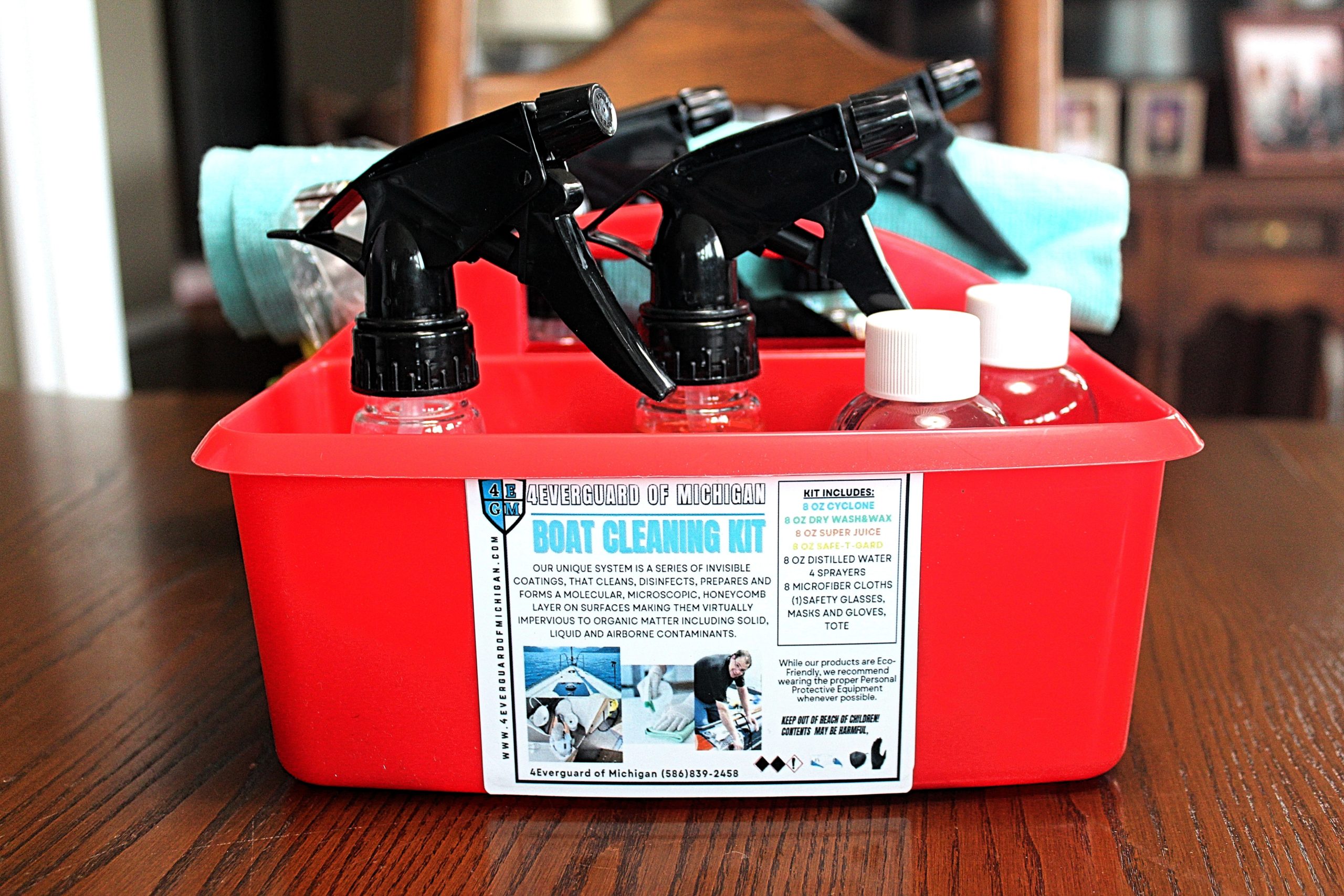 “We sell a Boat Cleaning Kit ($89.00) that contains Super Juice, Dry Wash Wax (graphene ceramic wax), Safe-T Gard (hospital-grade disinfectant that kills 99.999% of all molds, mildew, viruses, bacteria; it lasts 6 months), and Cyclone (degreaser; takes spots off).”