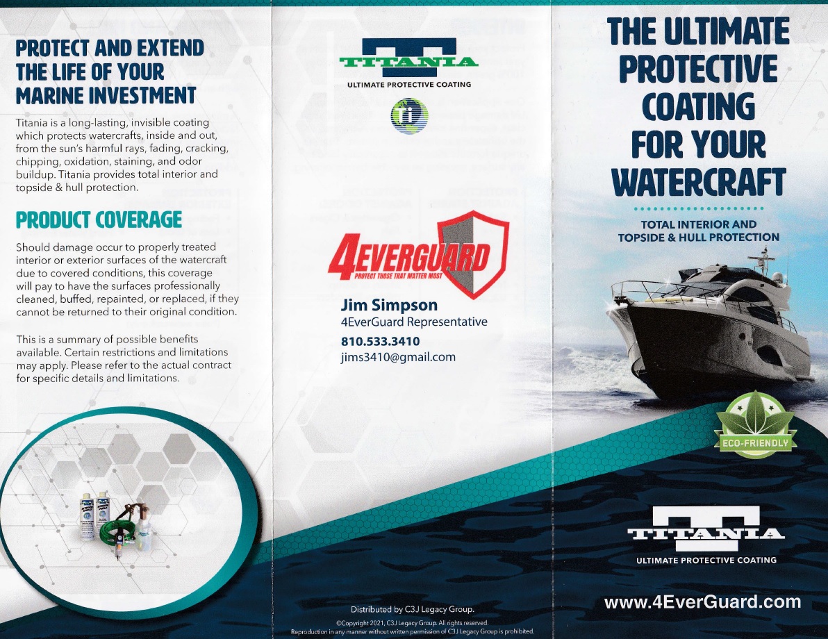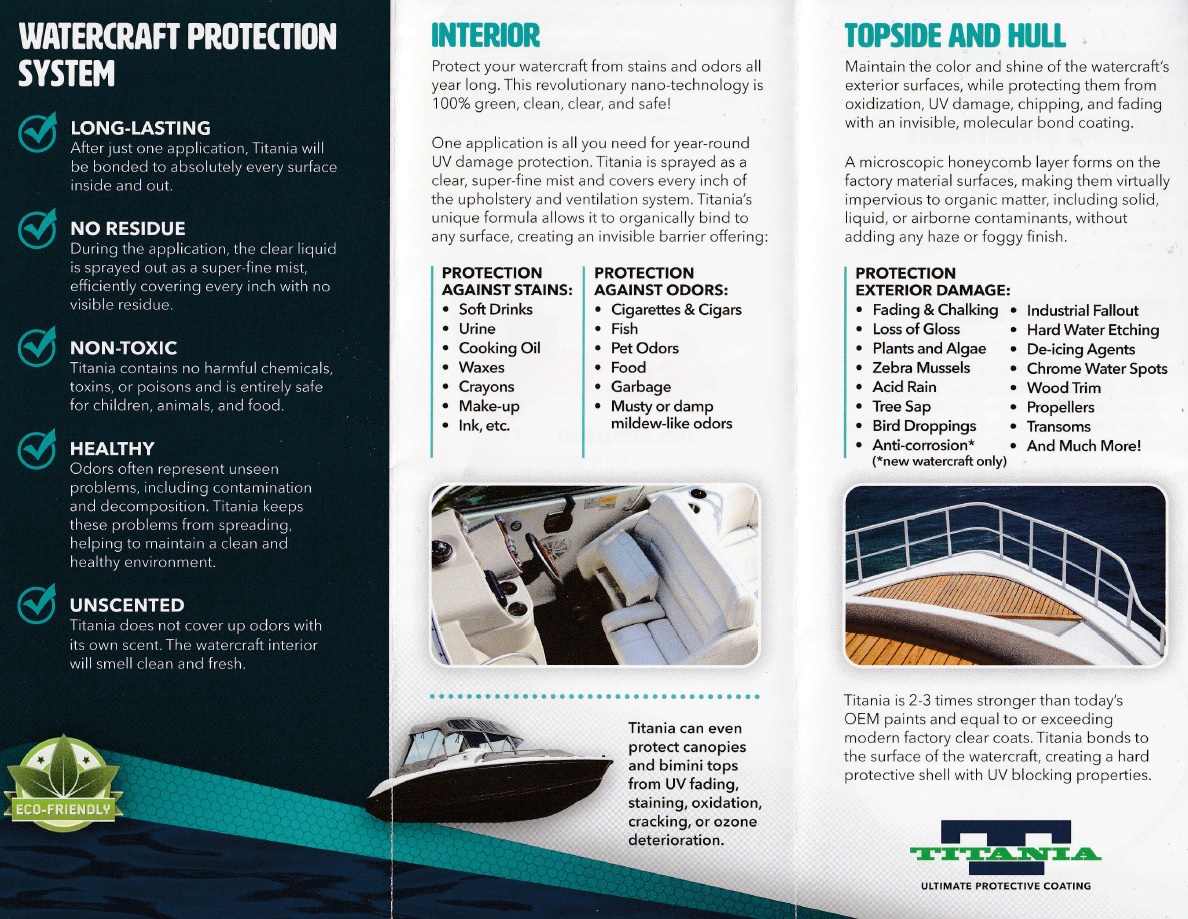 “Titania is colorless, odorless, and you spray it with a special nozzle. Titania forms a barrier to protect against constantly moving radicals, so that nothing sticks to it. It was invented by a neurosurgeon/chemist in Phoenix who patented it. We’re a direct distributor for him. Once treated with Titania, you do not need to use any other cleaning products for five years. All you have to do is wash your boat or vehicle.”