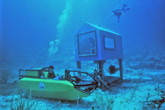 At right is his shark hunter which he used to access a private underwater habitat in 1990. The house was about 30 ft down, and entered through an opening on the floor.