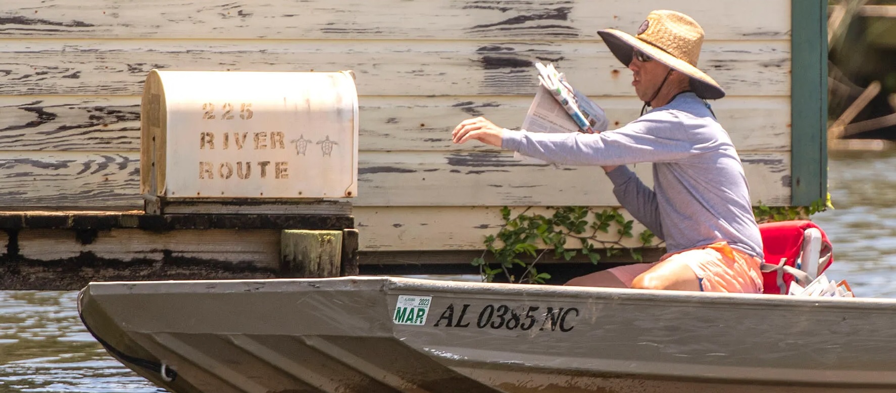 Dock-to-dock delivery on Alabama’s Magnolia River is provided to dock-side mailboxes along a 31-mile stretch of water.