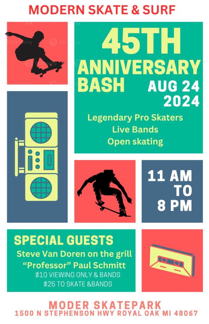 Modern Skate & Surf is celebrating their 45th Anniversary legendary Pro Skaters, Live Bands, Beer Tent, Create A Skate Classes, and much more.