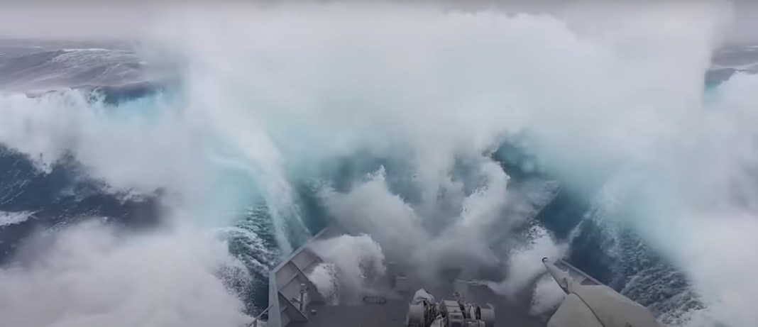 During a patrol search against illegal fishing of tooth-fish poachers this royal navy warship got smashed frontally by a huge monster wave.